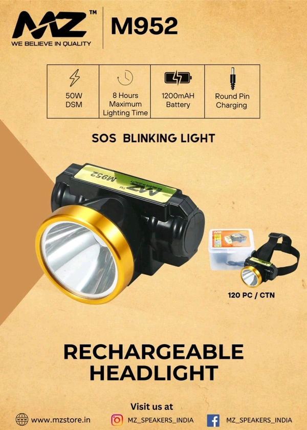 MZ M952 Rechargeable Head Torch With 3 Mode •Low •High •SOS Blinking