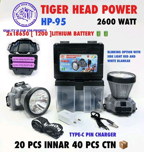 New Tiger Head Power HP-95 Head Torch 2600Watt + Blinking Option With Side Light Red & White Blinker Type-c Charging Pin (PREMIUM QUALITY)