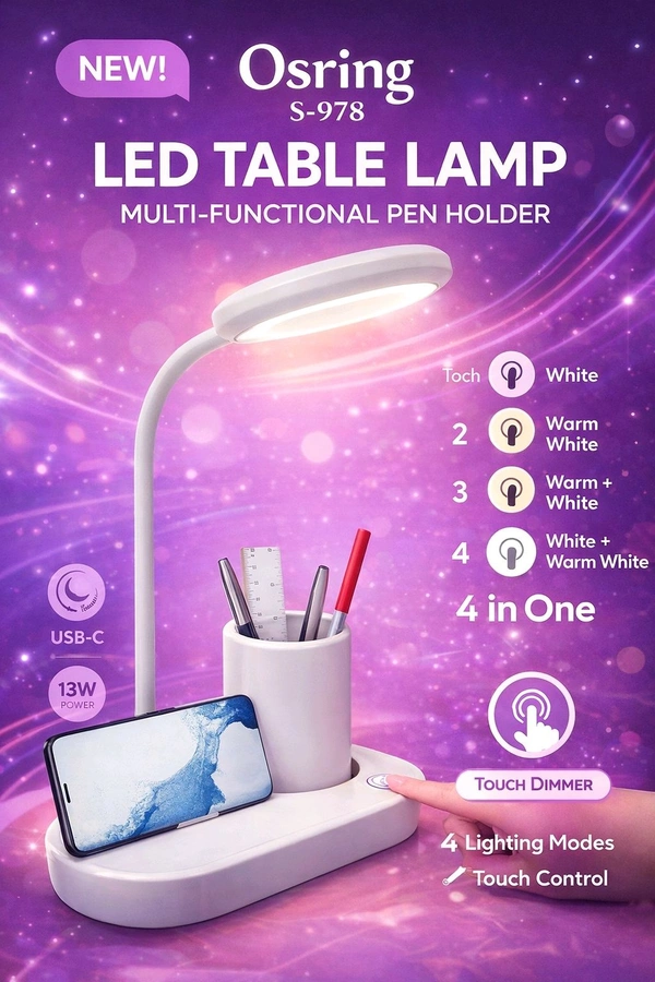 Osring OS-978 LED Table Lamp, a multifunctional desk lamp with a built-in pen holder, phone stand, and dimmable lighting